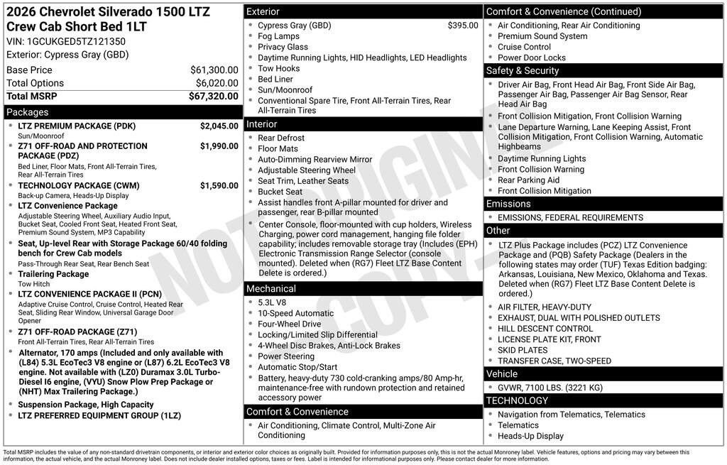 Purchase our 2026 Chevrolet Silverado 1500 LTZ Crew Cab 4X4 with the Z71 Off-Road & Protection, Convenience, Plus and Technology Package to enjoy premium style and capability in Cypress Gray! Motivated by a 5.3 Liter V8 that supplies 355hp to a 10 Speed Automatic transmission. That muscle and an automatic locking rear differential help you handle hard work, daily commuting, and weekend fun, and this Four Wheel Drive truck sees nearly 19mpg on the highway. Our Silverado 1500's bold exterior is backed by the Z71 Off-Road & Protection Package's twin-tube shocks, hill descent control, skid plates, ChevyTec spray-on Bedliner, dual exhaust, 2-speed transfer case, Z71 badging, high-intensity LED headlamps, fog lamps, perimeter lighting, 20-inch alloy wheels, a power up/down tailgate, heated power-folding mirrors, and a mighty grille.