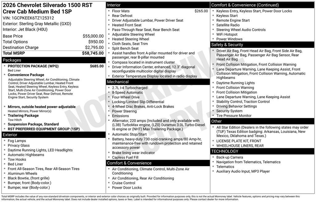 Deliverying everyday comfort and modern performance, our 2026 Chevrolet Silverado 1500 RST Crew Cab 4X4 is built with turbo strength and a bold design in Sterling Gray Metallic delivers everyday comfort, smart tech, and modern performance for every mile. Motivated by a 2.7L TurboMax delivering 310hp to an 8 Speed Automatic transmission. This Four Wheel Drive truck also features an auto-locking rear differential for sure-footed capability, and it sees nearly 21mpg on the highway with bold RST details. A black Bowtie highlights the grille, complementing LED lighting, fog lamps, a power lock/release EZ Lift tailgate, 18-inch alloy wheels, LED bed lighting, and painted mirror caps.