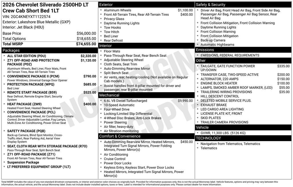 Refined and Diesel powered, our 2026 Chevrolet Silverado 2500 LT Crew Cab 4X4 rides with terrific truck appeal in Lakeshore Blue Metallic! Motivated by a TurboCharged 6.6 Liter DuraMax Diesel V8 offering 470hp and 975lb-ft of torque to a 10 Speed Allison Automatic transmission for muscular towing and hauling capabilities. An HD suspension and auto-locking rear differential help you handle hard work without breaking a sweat, and this Four Wheel Drive truck stands strong with an impressive range of standard features. Highlights include chrome bumpers, alloy wheels, power trailering mirrors, an EZ lift and lower tailgate, LED taillamps, side/rear bed steps, a trailer hitch, and cargo-bed lighting.
