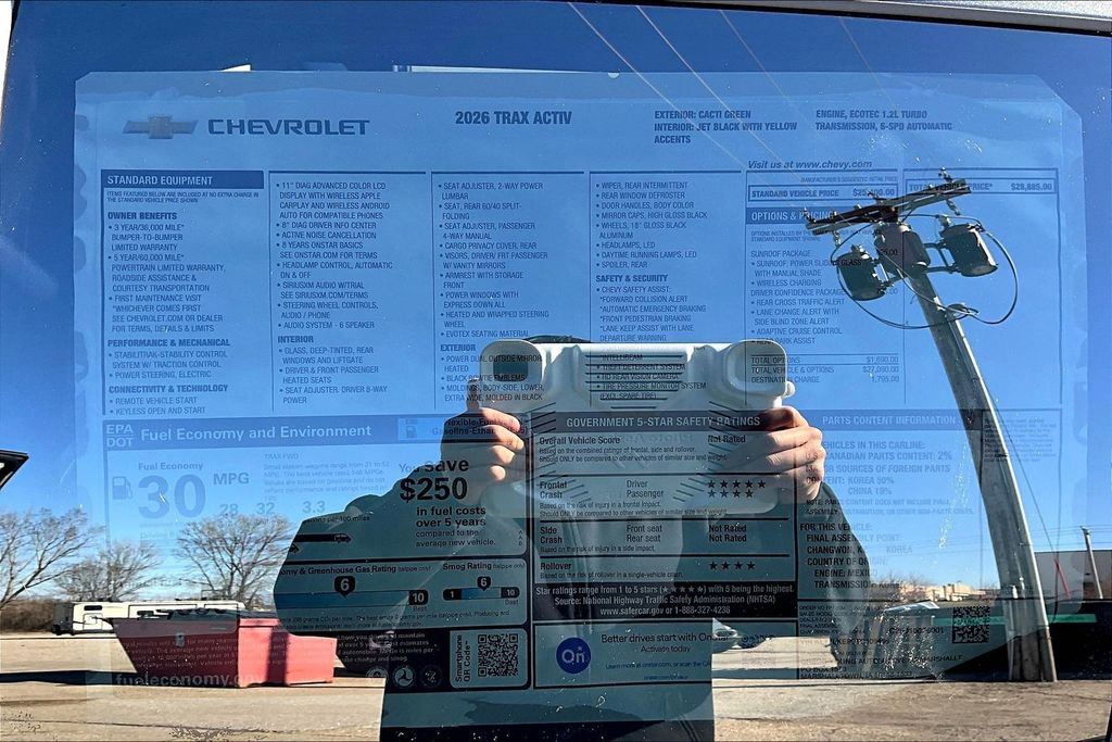 Designed for drivers who crave attitude in a small package, the 2026 Chevrolet Trax ACTIV in Cacti Green with the Sunroof Package delivers sporty versatility with everyday practicality. Powered by a TurboCharged 1.2 Liter 3 Cylinder delivering 137hp to a 6 Speed Automatic transmission for a bold boost of acceleration. Sized right for city adventures, this Front Wheel Drive SUV returns nearly 32mpg on the highway with a ruggedly refined design. Owners love the look of our Trax, which makes a bold impression with a power sunroof, a black grille, LED signature lighting, heated power mirrors, roof rails, black Bowties, a front recovery hook, and alloy wheels.