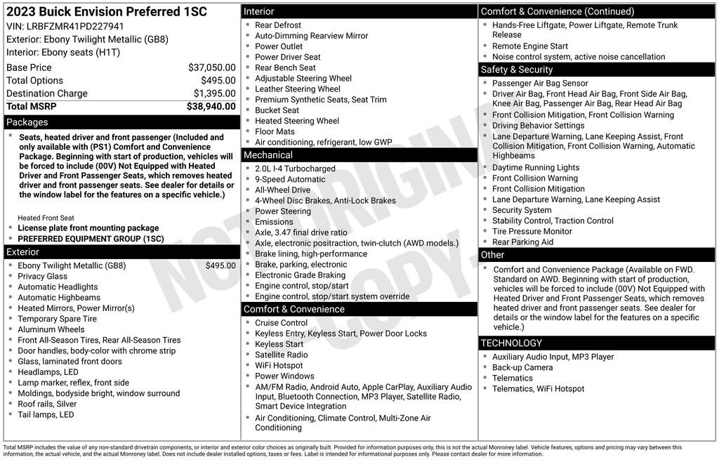 Be the envy of your friends with our Accident Free 2023 Buick Envision Preferred AWD that's dressed to impress in Ebony Twilight Metallic! Motivated by a TurboCharged 2.0 Liter EcoTec 4 Cylinder delivering 228hp connected to a 9 Speed Automatic transmission with Driver Shift Control. Premium handling helps keep you confidently on the move, and this All Wheel Drive SUV also scores nearly 29mpg on the highway. Our Envision invites you to ride in style with its LED lighting, 18-inch alloy wheels, heated power mirrors, bright bodyside moldings, and versatile roof rails.