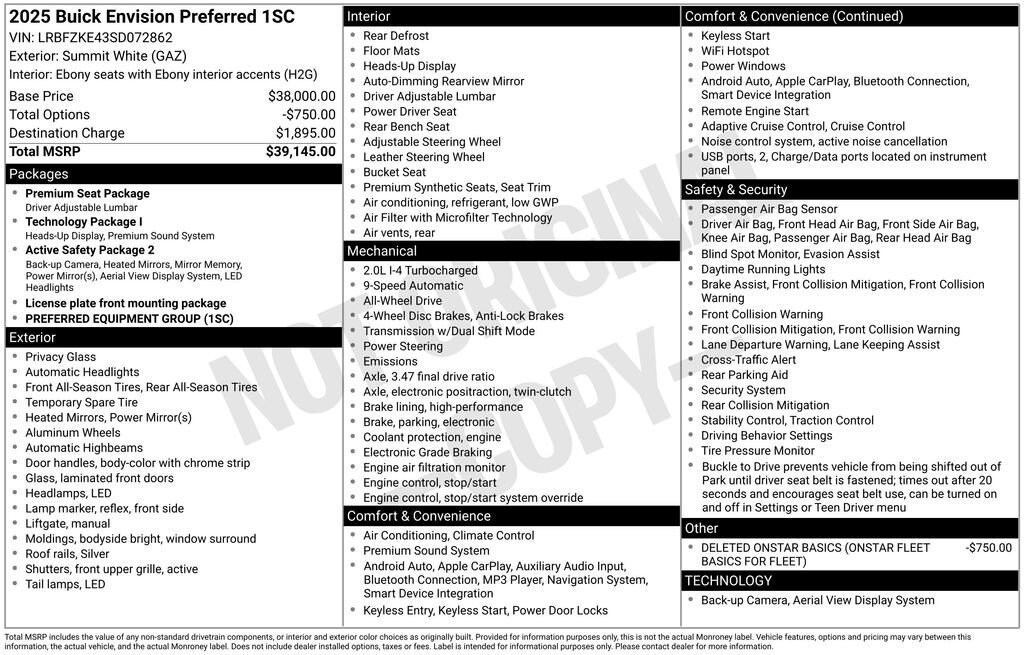 Our **One Owner**Accident Free**2025**Buick**Envision**Preferred**AWD**Navigation**Leather Seats** invites you to enjoy an elevated ownership experience in Summit White! Powered by a TurboCharged 2.0 Liter 4 Cylinder supplying 228hp to a 9 Speed Automatic transmission for refined performance. You can also benefit from premium ride and handling in this All Wheel Drive SUV, which returns nearly 28mpg on the highway with a sleek and stylish exterior. It's a sophisticated look that helps turn heads with LED lighting, silver roof rails, bright bodyside molding, eye-catching 18-inch alloy wheels, and heated power mirrors with memory.