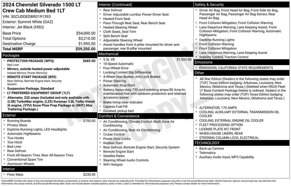 Refined and powerful, our **One Owner**Accident Free**2024**Chevrolet**Silverado 1500**LT**Crew Cab**4X4**Heated Seats**Heated Steering Wheel** is capable of ruling your world in Summit White! Motivated by a 5.3 Liter V8 serving up 355hp to a 10 Speed Automatic transmission with tow/haul mode for premier pulling potential. This Four Wheel Drive truck also features an auto-locking rear differential for better traction on slippery surfaces, and it returns nearly 20mpg on the highway with a mighty presence. Our Silverado's design appeals to truck lovers with high-intensity LED headlamps, premium wheels, an EZ Lift power lock/release tailgate, a trailer hitch, a 120V outlet, a spray-on bedliner, and head-turning chrome accents.