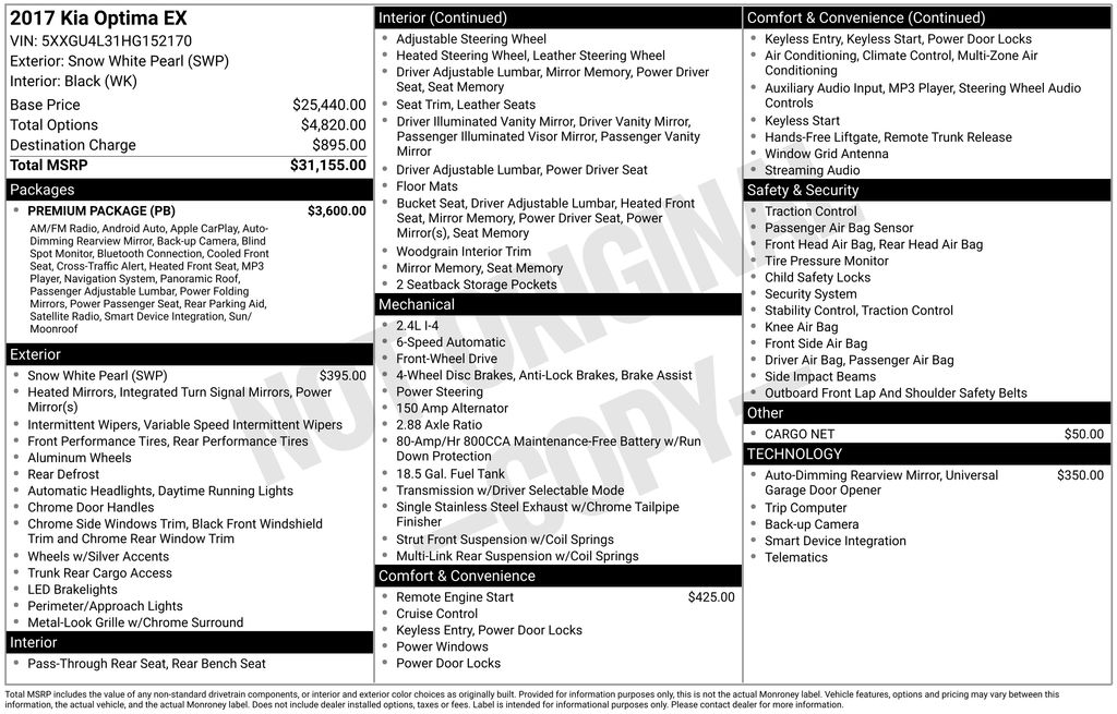 Bought my first KIA; a Forte in 2013 and was hooked. Still upset I turned that one in after the lease period was up. Stepped up to my current KIA after that and have been very happy. My Grey 2016 Optima LX will never be a head turner. Although a good looking car, it is very similar to many of the rounded, low flying bodystyles of many of the medium sized sedans in its vintage. But for comfort, ride quality and value it is unbeatable! First.... and only, the con. Within a year or so of ownership I started to notice a rattling in the front suspension system. It was quite annoying and was only noticeable on rougher roads and bigger bumps. Turned out to be a loose upper strut nut had come loose. All were tightened under warranty and have had NO problems since. As to the Pros, I continue to be blown away by the quiet, solid and exceptionally smooth ride of the car. Originally from California, I drove the car to the Northern Plains over a 2 1/2 day trek thru Nevada, Utah, Wyoming and North Dakota. The cruise control holds speed well and the ride was absolutely dreamy while the cars tracking on the road has always been excellent. The transmission shifts flawlessly, both smooth and quiet. When the accelerator is smashed the engine revs appropriately and gets one into the passing lane efficiently although not sportingly. This car's cloth seating which has been surprisingly durable and easy to clean when necessary. I do wish the LX trim level included auto up/down windows throughout as only the drivers side includes auto down. Lastly, the trunk is cavernous. I can easily put 3 golf bags; 4 with a little work into the rear. It has gotten a family of four across state to many a tournament baseball game. Split folding seats come in handy when I need to get some bigger hardware home from Home Depot. Oh, one item I never quite got used to was the lack of a spare tire. Although I never needed it, the included electric air pump and tire gel always unnerved me at the thought of ever needing to use it. Don't let me forget to mention that KIA has one of (if not) the best warranties on the market. 10 year, 100,00 mile powertrain and 5 year, 60,000 mile basic warranty. In closing, I am a true KIA lover! I challenge you to match the trim level of competing automobile at the KIA price point. I have owned a Honda Civic, a Toyota Camry, a Nissan Stanza, a Ford Explorer and more recently a Chevy 1500 Silverado. My son now drives the Optima in college and upon returning home this spring a smile was once again put on my face when I got behind the wheel. I am currently shopping for another KIA for my soon to be second college student. I am really liking the new Forte, six-speed GT. Happy driving. - 5.0